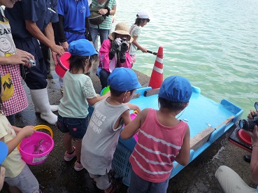 小さなクロダイに子供たちは興味深々です。 大きく育て、と願いながら放流します。
